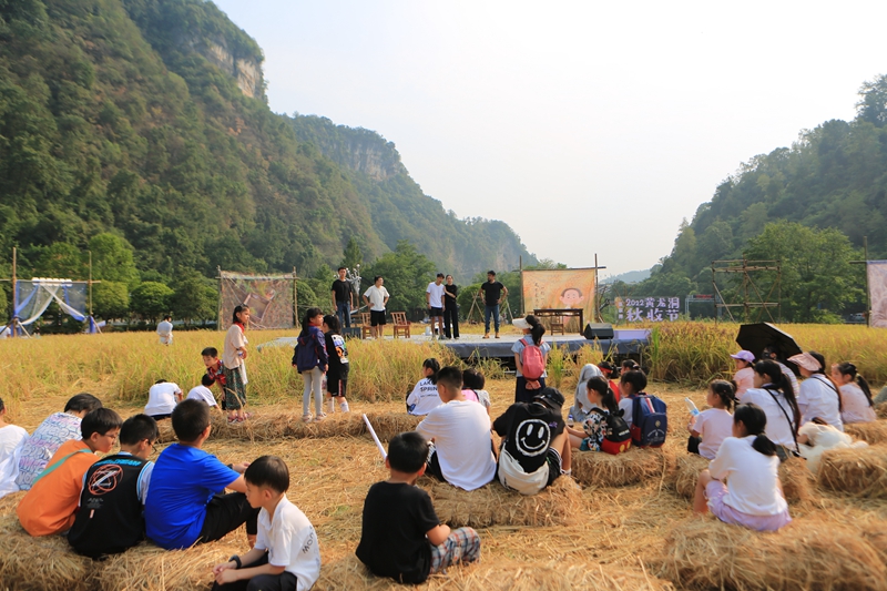 除了稻谷收割勞作體驗(yàn)、勞動實(shí)踐這一常規(guī)保留項(xiàng)目外,第三屆黃龍洞秋收節(jié)還舉辦了包括稻作研學(xué)、稻田集市、田園音樂會、非遺文化體驗(yàn)、戲劇藝術(shù)展演等豐富多彩的活動。在為期五天時間里,吸引了三萬多客人從四面八方趕赴過來。大家歡聚在黃龍洞外山谷的金色田野里,一起體驗(yàn)勞動的快樂,感受豐收的喜悅,樂享戶外親子休閑生活。